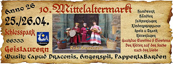 Musikalische Klänge gibt es wieder von „Capud Draconis“, die überregional bekannte Band mit Dudelsäcken und Trommel gibt was auf die Ohren. Neu dabei: „Angerspil“, als Trio kommen sie und spielen unterschiedliche Instrumente und bringen auch den Rattenfänger mit - Kinder lasst euch überraschen. Aus Hessen reist das Duo „PapperlaBarden“ an. Sehr bekannt auf der Erdenscheibe und nun zum ersten Mal im Saarland, sind sie die Barden für Bierangelegenheiten.