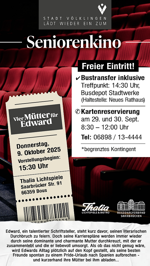 Am 9. Oktober 2025 um 15:30 Uhr lädt die Stadtverwaltung interessierte Völklinger Seniorinnen und Senioren ab dem Alter von 60 Jahren ins Kino ein. Im Thalia Lichtspiele-Kino in Bous wird der Spielfilm „Vier Mütter für Edward“ gezeigt.