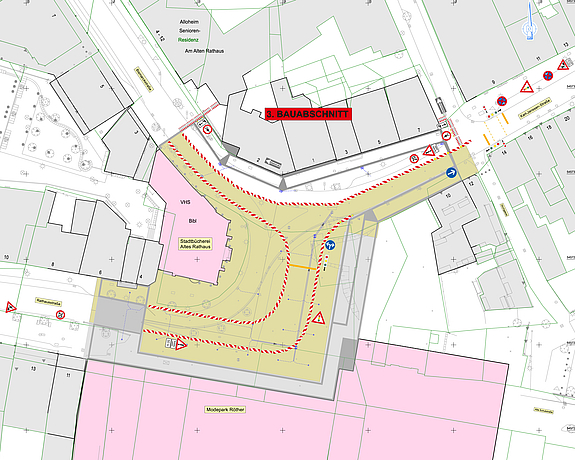 Mit Beginn des letzten Bauabschnitts ändert sich zum 21. Oktober die Verkehrsführung: Der Verkehr auf dem Vorplatz wird dann durch eine temporäre Ampelanlage geregelt. Ab diesem Zeitpunkt ist es wieder möglich, vom Vorplatz aus nach links in die Bismarckstraße abzubiegen, die Einbahnstraßenregelung in der Karl-Janssen-Straße wird aufgehoben. Die Ampelschaltung in der Moltkestraße wird auf die veränderte Verkehrsführung abgestimmt.